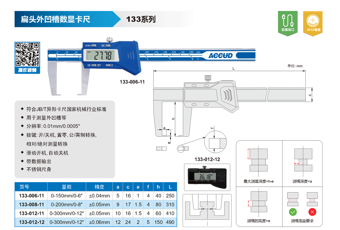 簡短描述: ? 符合JB/T異形卡尺國家機械行業(yè)標準 ? 用于測量外凹槽等 ? 分辨率 0.01mm/0.0005" ? 按鍵: 開/關(guān)機, 置零, 公/英制轉(zhuǎn)換, 相對/絕對測量轉(zhuǎn)換 ? 滑動開機 自動關(guān)機 ? 帶數(shù)據(jù)輸出 ? 不銹鋼尺身