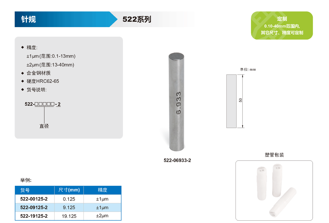簡短描述: ? 精度: ±1μm (范圍:0.1-13mm) ±2μm (范圍:13-40mm) ? 合金鋼材質(zhì) ? 硬度HRC62-65