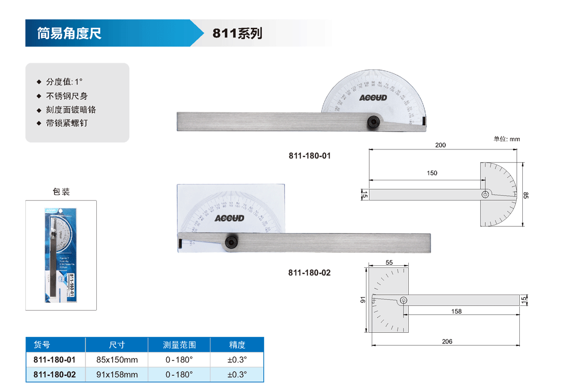 簡(jiǎn)短描述: ? 分度值:1° ? 不銹鋼尺身 ? 刻度面鍍暗鉻 ? 帶鎖緊螺釘