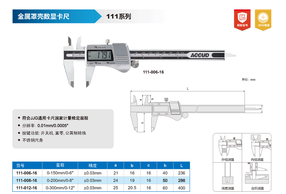簡(jiǎn)短描述: ? 符合JJG通用卡尺國(guó)家計(jì)量檢定規(guī)程 ? 分辨率: 0.01mm/0.0005" ? 按鍵功能: 開關(guān)機(jī), 置零, 公英制轉(zhuǎn)換 ? 不銹鋼尺身