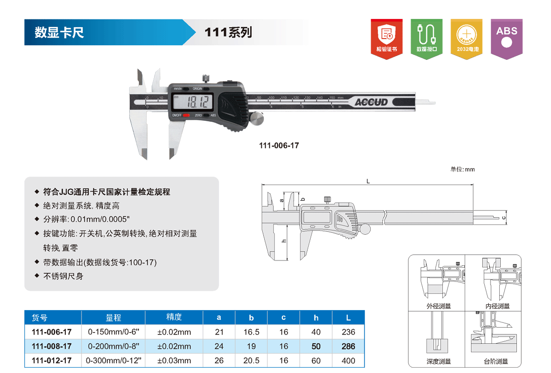 簡短描述: ? 符合JJG通用卡尺國家計量檢定規(guī)程 ? 絕對測量系統(tǒng),精度高 ? 分辨率: 0.01mm/0.0005" ? 按鍵功能: 開關(guān)機,公英制轉(zhuǎn)換, 絕對相對測量 轉(zhuǎn)換, 置零 ? 帶數(shù)據(jù)輸出(數(shù)據(jù)線貨號:100-17) ? 不銹鋼尺身