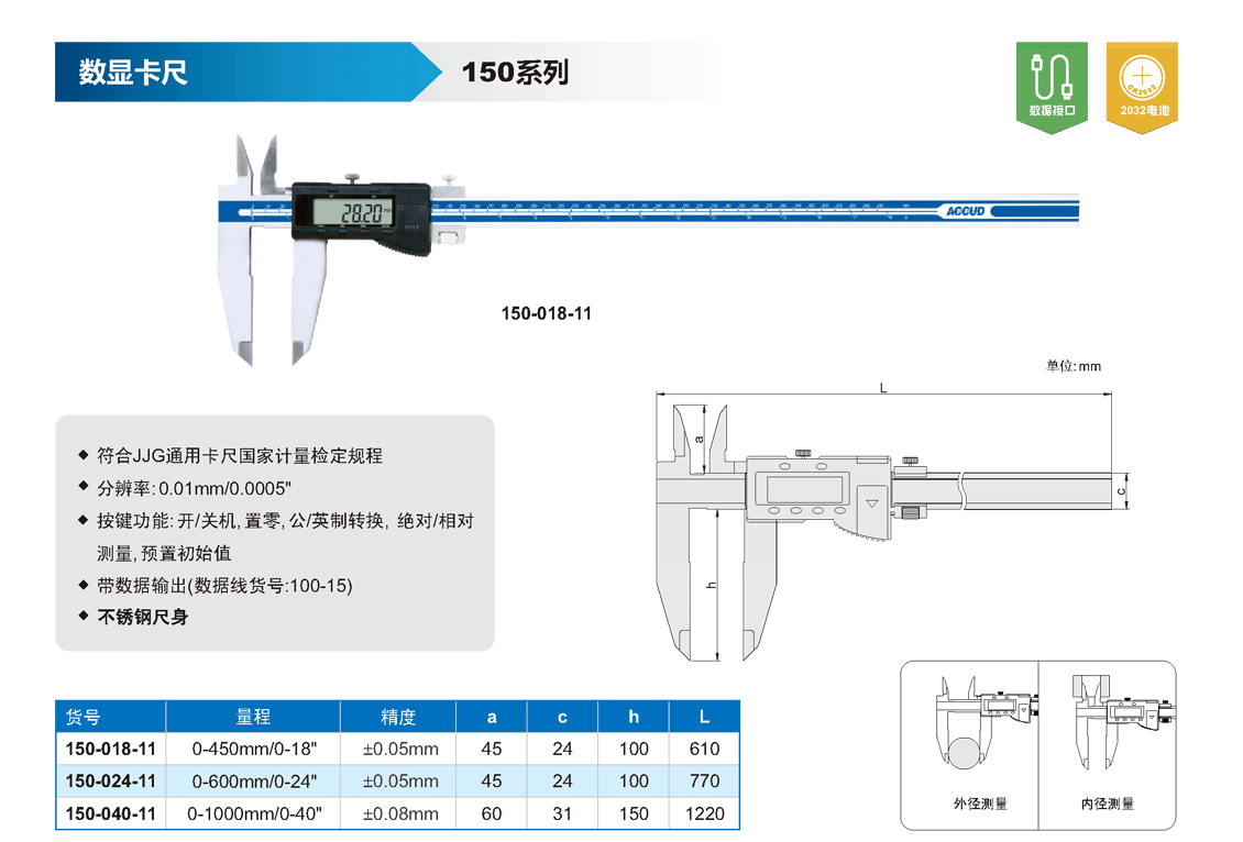 簡短描述: ? 符合JJG通用卡尺國家計(jì)量檢定規(guī)程 ? 分辨率: 0.01mm/0.0005" ? 按鍵功能: 開關(guān)機(jī), 置零, 公英制轉(zhuǎn)換, 絕對/相對 測量, 預(yù)置初始值 ? 帶數(shù)據(jù)輸出(數(shù)據(jù)線貨號:100-15) ? 不銹鋼尺身