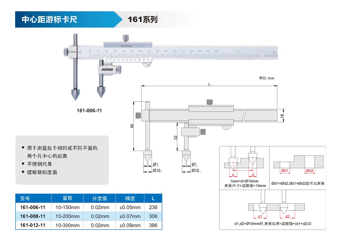 簡短描述: ? 用于測量處于相同或不同平面的兩個孔中心的距離 ? 不銹鋼尺身 ? 鍍暗鉻刻度面