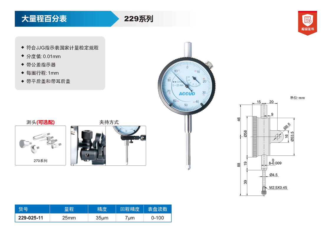 簡短描述: ? 符合JJG指示表國家計量檢定規(guī)程 ? 分度值:0.01mm ? 帶公差指示器 ? 每圈行程:1mm ? 帶平后蓋和帶耳后蓋