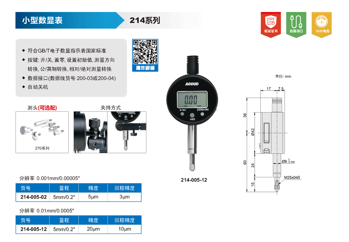 簡短描述: ? 符合GB/T電子數(shù)顯指示表國家標準 ? 按鍵: 開/關(guān), 置零, 設(shè)置初始值, 測量方向 轉(zhuǎn)換, 公/英制轉(zhuǎn)換, 相對/絕對測量轉(zhuǎn)換 ? 數(shù)據(jù)接口(數(shù)據(jù)線貨號:200-03或200-04) ? 自動關(guān)機