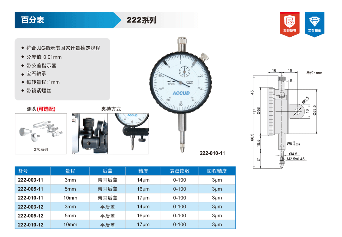 簡(jiǎn)短描述: ? 符合JJG指示表國(guó)家計(jì)量檢定規(guī)程 ? 分度值:0.01mm ? 帶公差指示器 ? 寶石軸承 ? 每轉(zhuǎn)量程:1mm ? 帶鎖緊螺絲