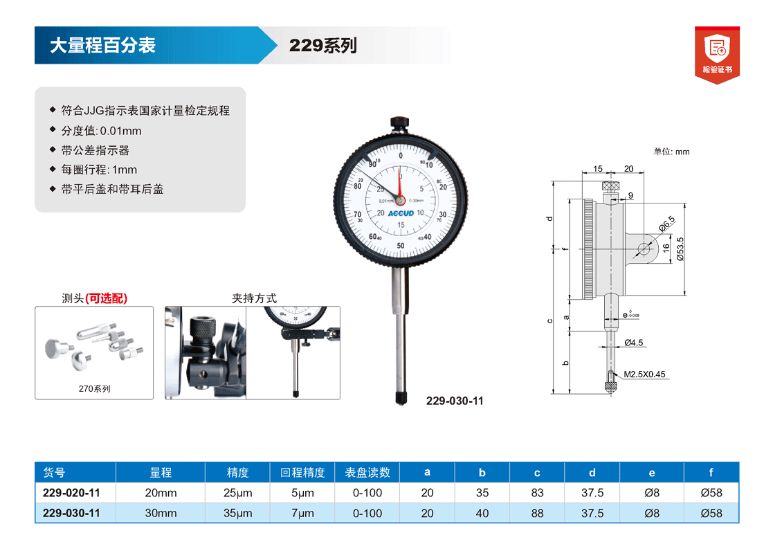 簡短描述: ? 符合JJG指示表國家計量檢定規(guī)程 ? 分度值:0.01mm ? 帶公差指示器 ? 每圈行程:1mm ? 帶平后蓋和帶耳后蓋