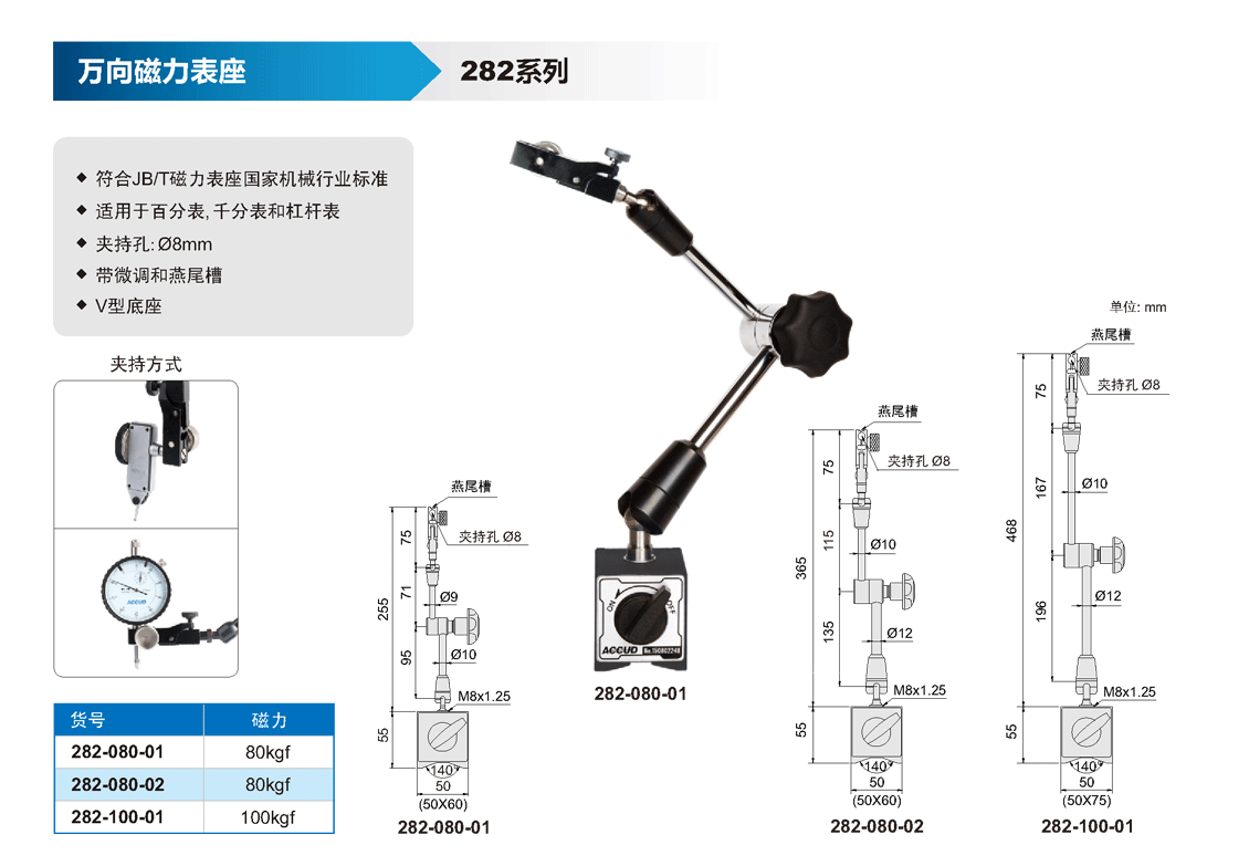 簡短描述: ? 符合JB/T磁力表座國家機(jī)械行業(yè)標(biāo)準(zhǔn) ? 適用于百分表, 千分表和杠桿表 ? 夾持孔: ?8mm ? 帶微調(diào)和燕尾槽 ? V型底座