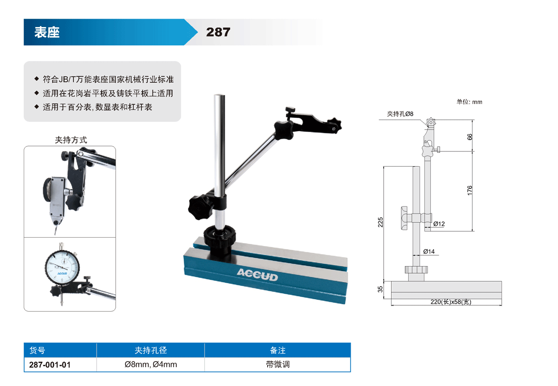 簡短描述: ? 符合JB/T萬能表座國家機械行業(yè)標(biāo)準(zhǔn) ? 適用在花崗巖平板及鑄鐵平板上適用 ? 適用于百分表, 數(shù)顯表和杠桿表