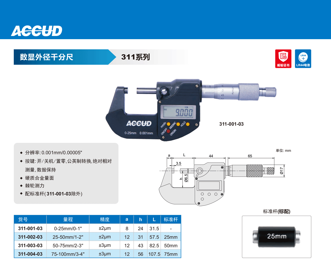 簡短描述: ? 分辨率: 0.001mm/0.00005" ? 按鍵: 開/關(guān)機(jī)/置零,公英制轉(zhuǎn)換, 絕對(duì)相對(duì) 測(cè)量, 數(shù)據(jù)保持 ? 硬質(zhì)合金量面 ? 棘輪測(cè)力 ? 配標(biāo)準(zhǔn)桿( 311-001-03除外)