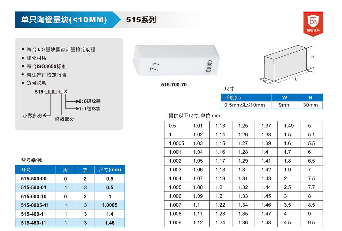 簡短描述: ? 符合JJG量塊國家計量檢定規(guī)程 ? 陶瓷材質(zhì) ? 符合ISO3650標準 ? 帶生產(chǎn)廠檢定報告