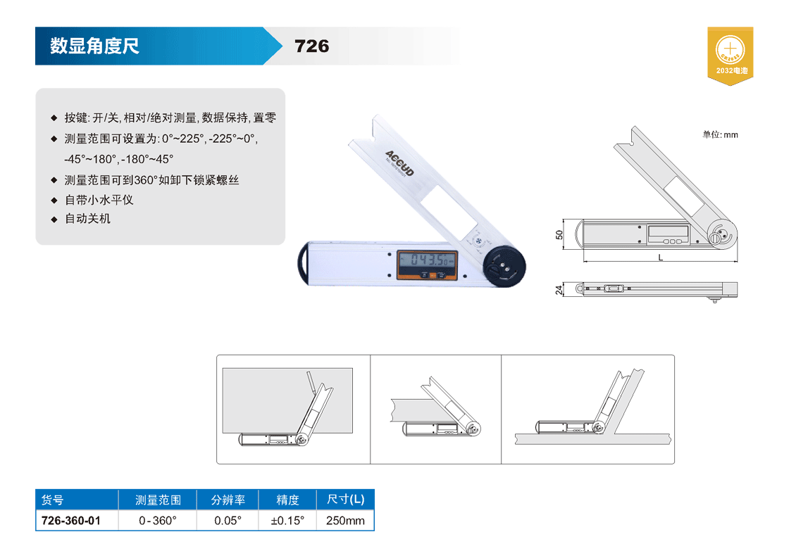簡短描述: ? 按鍵:開/關(guān),相對/絕對測量,數(shù)據(jù)保持,置零 ? 測量范圍可設(shè)置為: 0°~225, -225°~0°, -45°~180°,-1 80°~45° ? 測量范圍可到360°如卸下鎖緊螺絲 ? 自帶小水平儀 ? 自動關(guān)機(jī)