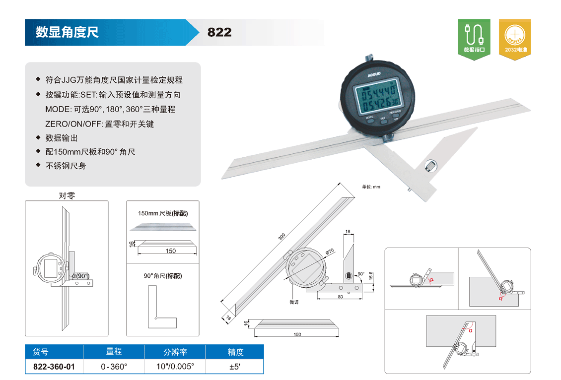 簡短描述: ? 符合JJG萬能角度尺國家計量檢定規(guī)程 ? 按鍵功能: SET: 輸入預設值和測量方向 MODE: 可選90°, 180°, 360°三種量程 ZERO/ON/OFF: 置零和開關鍵 ? 數(shù)據(jù)輸出 ? 配150mm和300mm尺板 ? 配90° 角尺 ? 不銹鋼尺身
