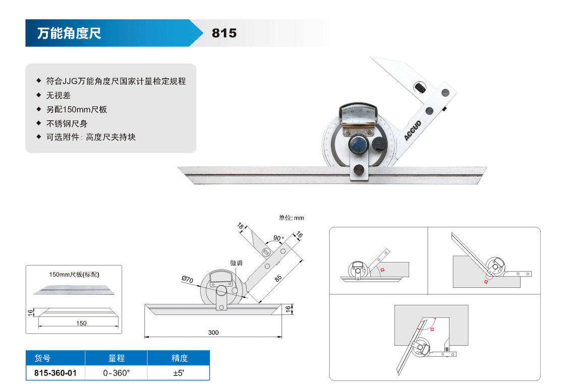 簡短描述: ? 符合JJG萬能角度尺國家計量檢定規(guī)程 ? 無視差 ? 另配150mm尺板 ? 不銹鋼尺身 ? 可選附件: 高度尺夾持塊