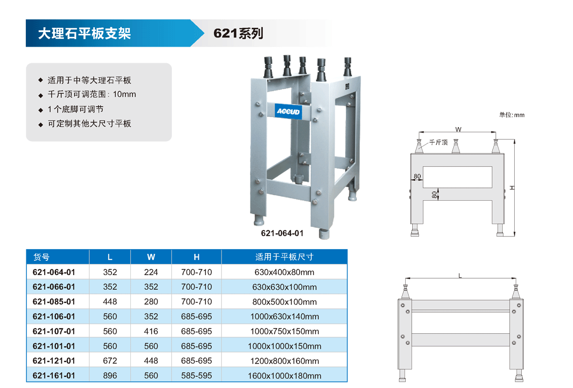 簡短描述: ? 適用于中等大理石平板 ? 千斤頂可調(diào)范圍: 10mm ? 1 個底腳可調(diào)節(jié) ? 可定制其他大尺寸平板