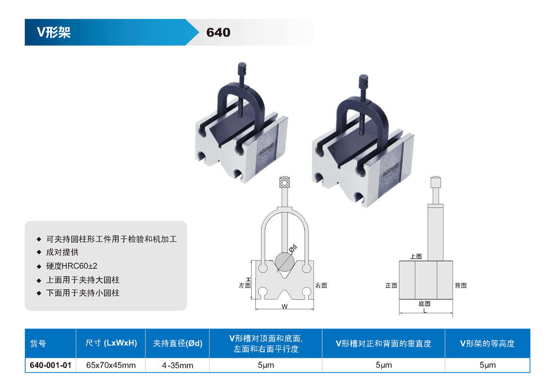 簡短描述: ? 可夾持圓柱形工件用于檢驗和機加工 ? 成對提供 ? 硬度HRC60±2 ? 上面用于夾持大圓柱 ? 下面用于夾持小圓柱