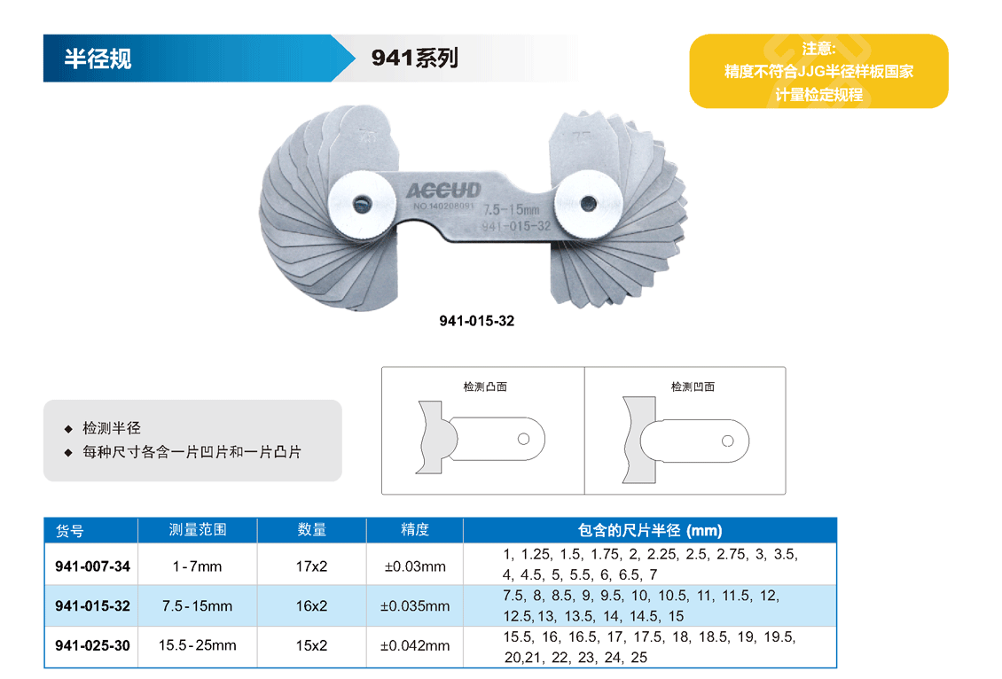 簡短描述: ? 檢測半徑 ? 每種尺寸各含一片凹片和一片凸片