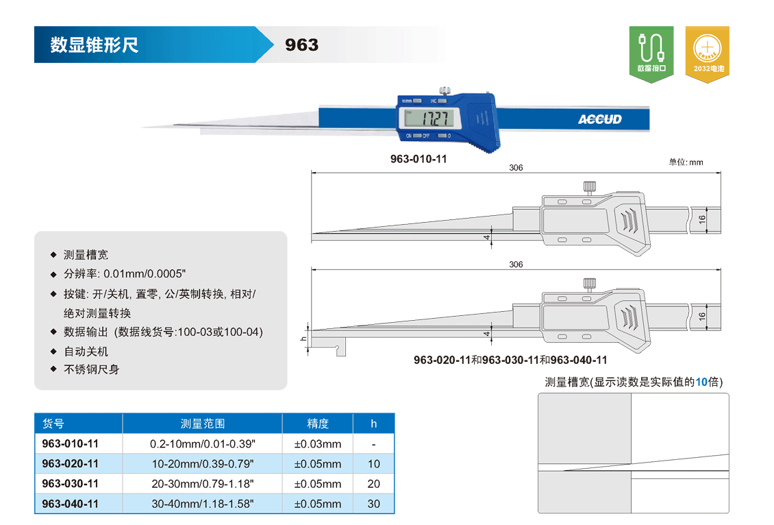 簡短描述: ? 測量槽寬 ? 分辨率: 0.01mm/0.0005" ? 按鍵: 開/關(guān)機(jī), 置零, 公/英制轉(zhuǎn)換, 相對/絕對測量轉(zhuǎn)換 ? 數(shù)據(jù)輸出(數(shù)據(jù)線貨號:100-03或100-04) ? 自動關(guān)機(jī) ? 不銹鋼尺身