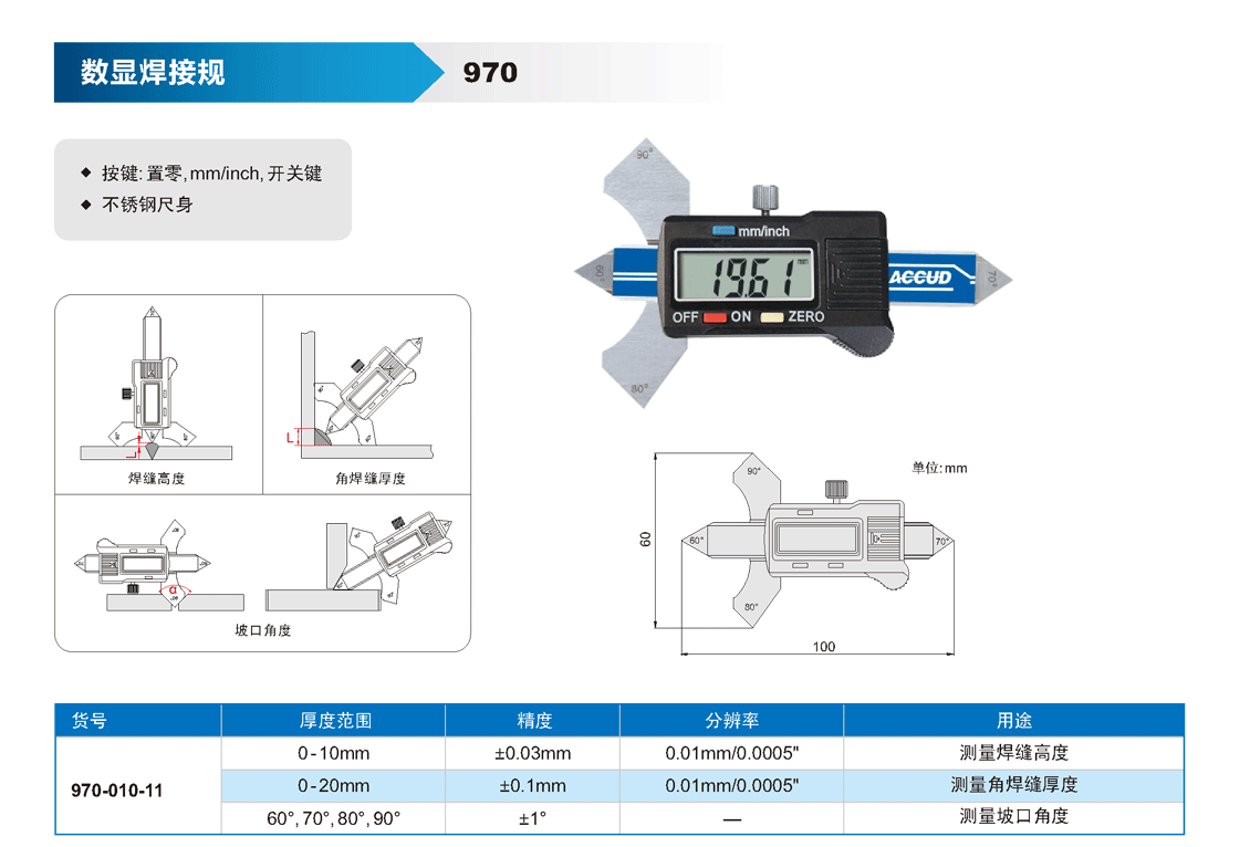 簡(jiǎn)短描述: ? 按鍵:置零,mm/inch,開關(guān)鍵 ? 不銹鋼尺身