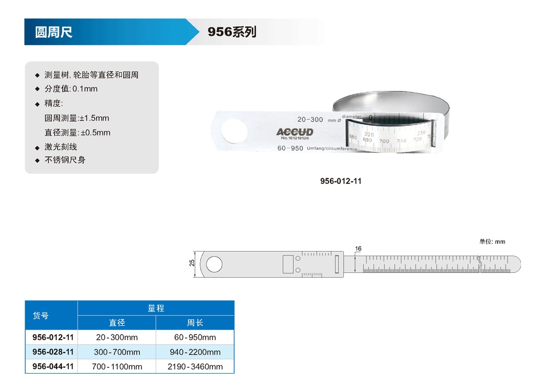 簡短描述: ? 測量樹,輪胎等直徑和圓周 ? 分度值: 0.1mm ? 精度: 圓周測量:±1.5mm 直徑測量:±O.5mm ? 激光刻線 ? 不銹鋼尺身