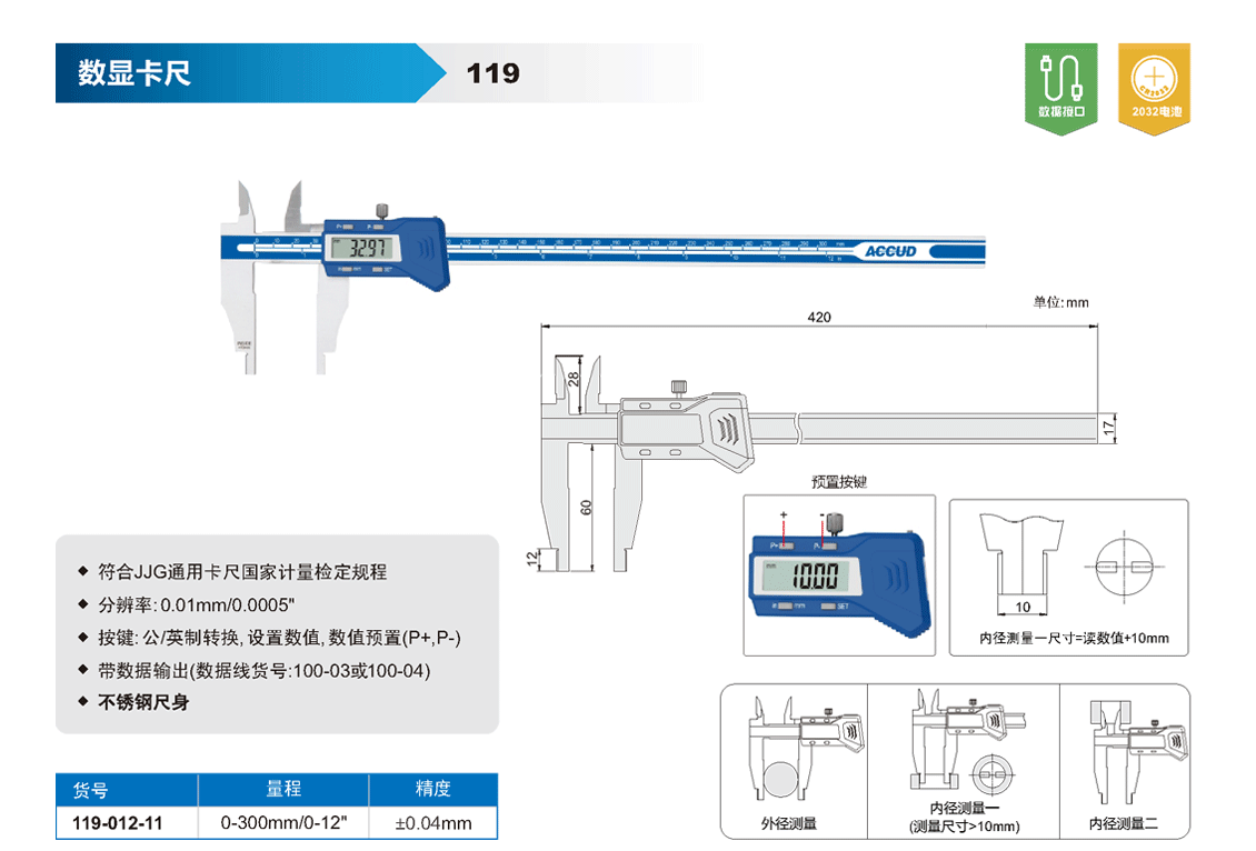 簡短描述: ? 符合JJG通用卡尺國家計量檢定規(guī)程 ? 分辨率: 0.01mm/0.0005" ? 按鍵: 公/英制轉(zhuǎn)換, 設(shè)置數(shù)值, 數(shù)值預(yù)置(P+,P-) ? 帶數(shù)據(jù)輸出(數(shù)據(jù)線貨號:100-03或100-04) ? 不銹鋼尺身