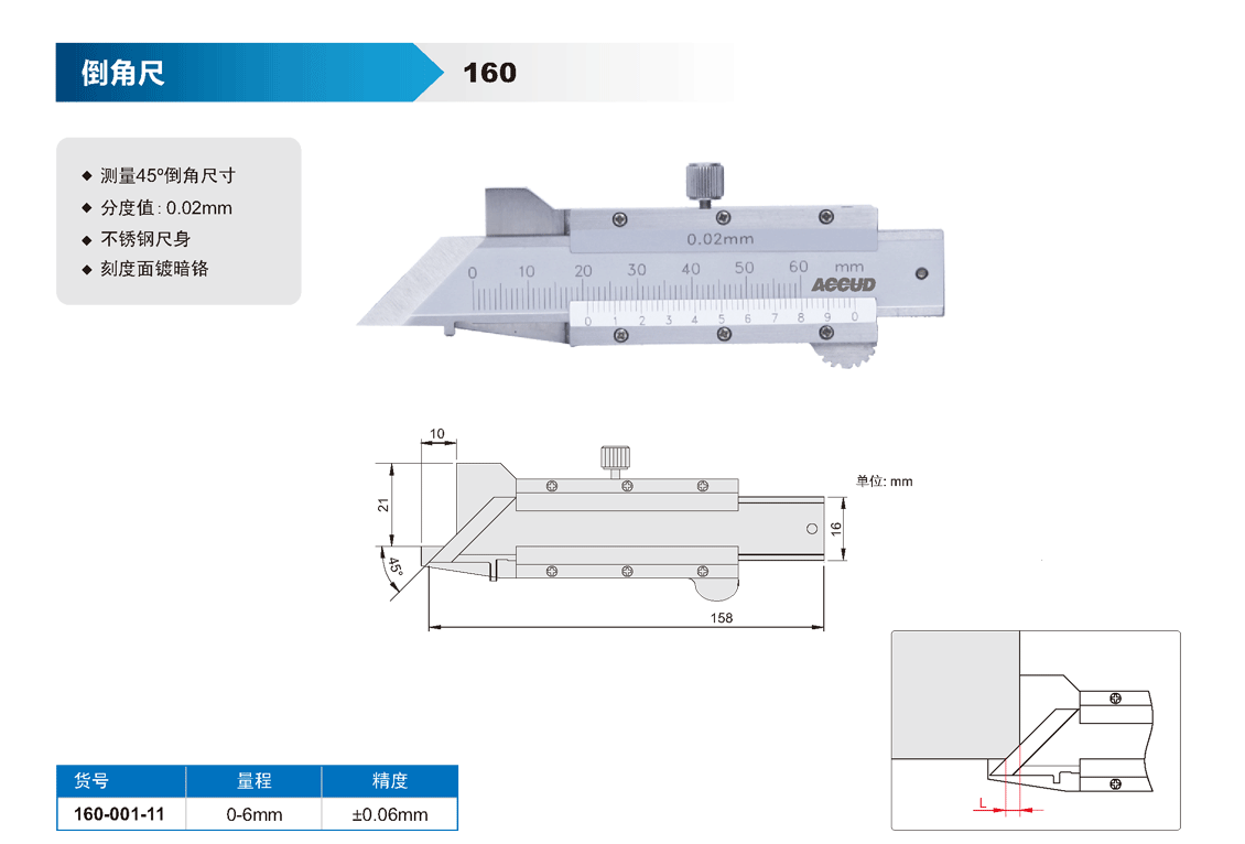 簡短描述: ? 測量45o倒角尺寸 ? 分度值:0.02mm ? 不銹鋼尺身 ? 刻度面鍍暗鉻
