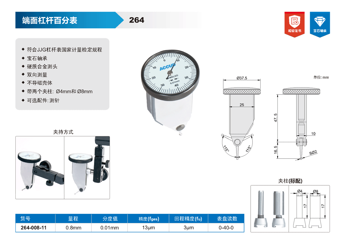 簡(jiǎn)短描述: ? 符合JJG杠桿表國(guó)家計(jì)量檢定規(guī)程 ? 寶石軸承 ? 硬質(zhì)合金測(cè)頭 ? 雙向測(cè)量 ? 不導(dǎo)磁殼體 ? 帶兩個(gè)夾柱: ?4mm和 ?8mm ? 可選配件: 測(cè)針