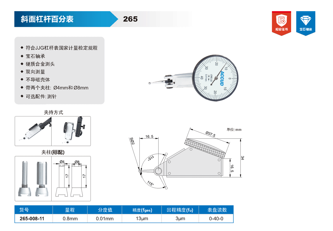 簡(jiǎn)短描述: ? 符合JJG杠桿表國(guó)家計(jì)量檢定規(guī)程 ? 寶石軸承 ? 硬質(zhì)合金測(cè)頭 ? 雙向測(cè)量 ? 不導(dǎo)磁殼體 ? 帶兩個(gè)夾柱: ?4mm和 ?8mm ? 可選配件: 測(cè)針