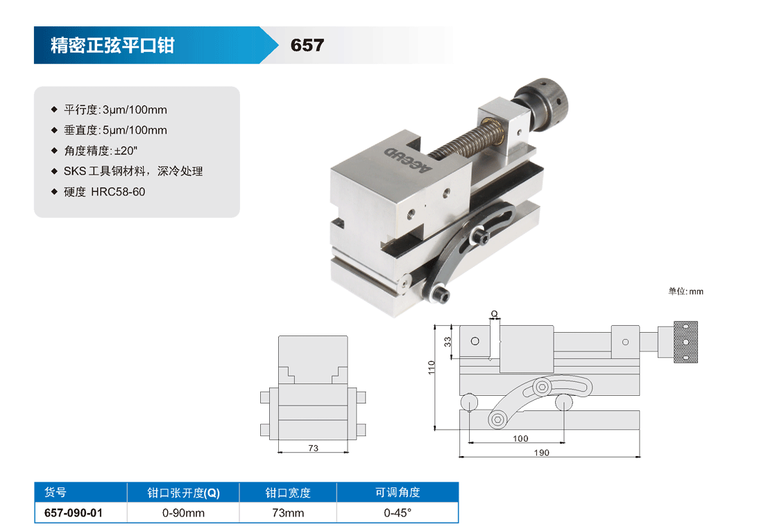 簡(jiǎn)短描述: ? 平行度: 3μm/100mm ? 垂直度: 5μm/100mm ? 角度精度: ±20" ? SKS 工具鋼材料,深冷處理 ? 硬度 HRC58-60