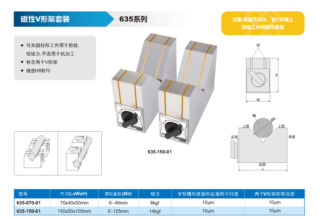 簡(jiǎn)短描述: ? 可夾圓柱形工件用于檢驗(yàn) 低磁力 不適用于機(jī)加工 ? 包含兩個(gè)V形架 ? 硬度 HRB70