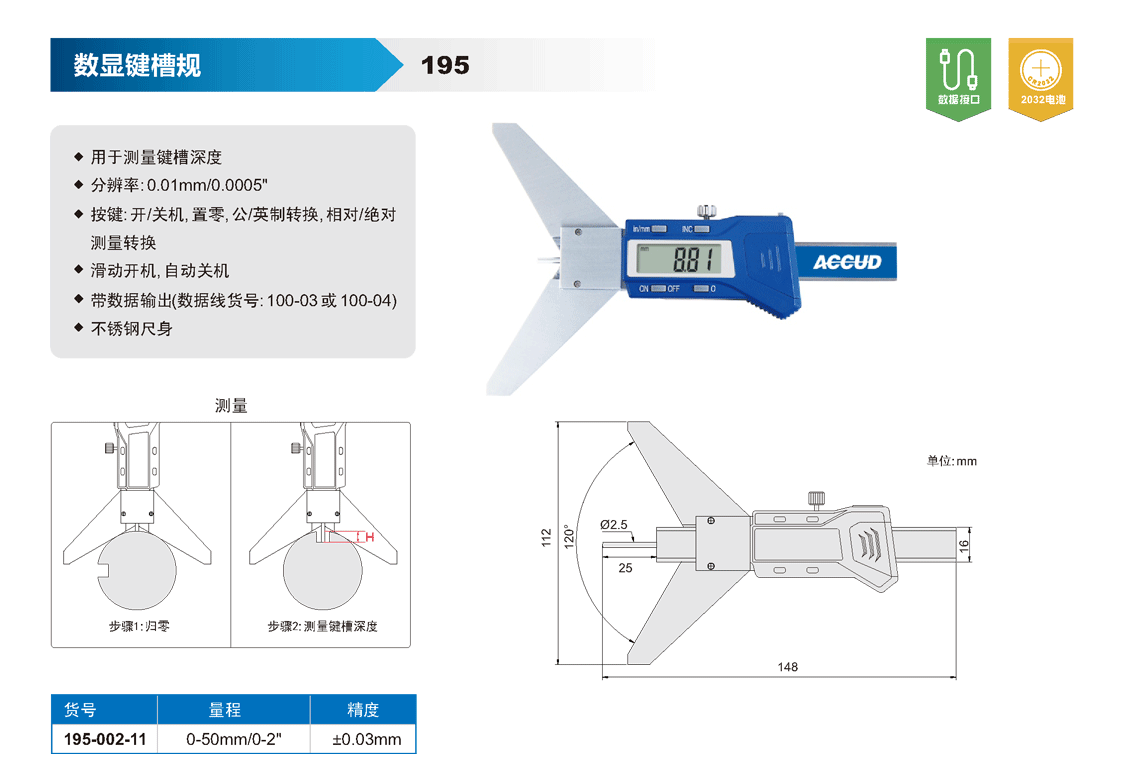 簡短描述: ? 用于測量鍵槽深度 ? 分辨率: 0.01mm/0.0005" ? 按鍵: 開/關機, 置零, 公/英制轉換, 相對/絕對測量轉換 ? 滑動開機,自動關機 ? 帶數據輸出(數據線貨號: 100-03 或 100-04) ? 不銹鋼尺身