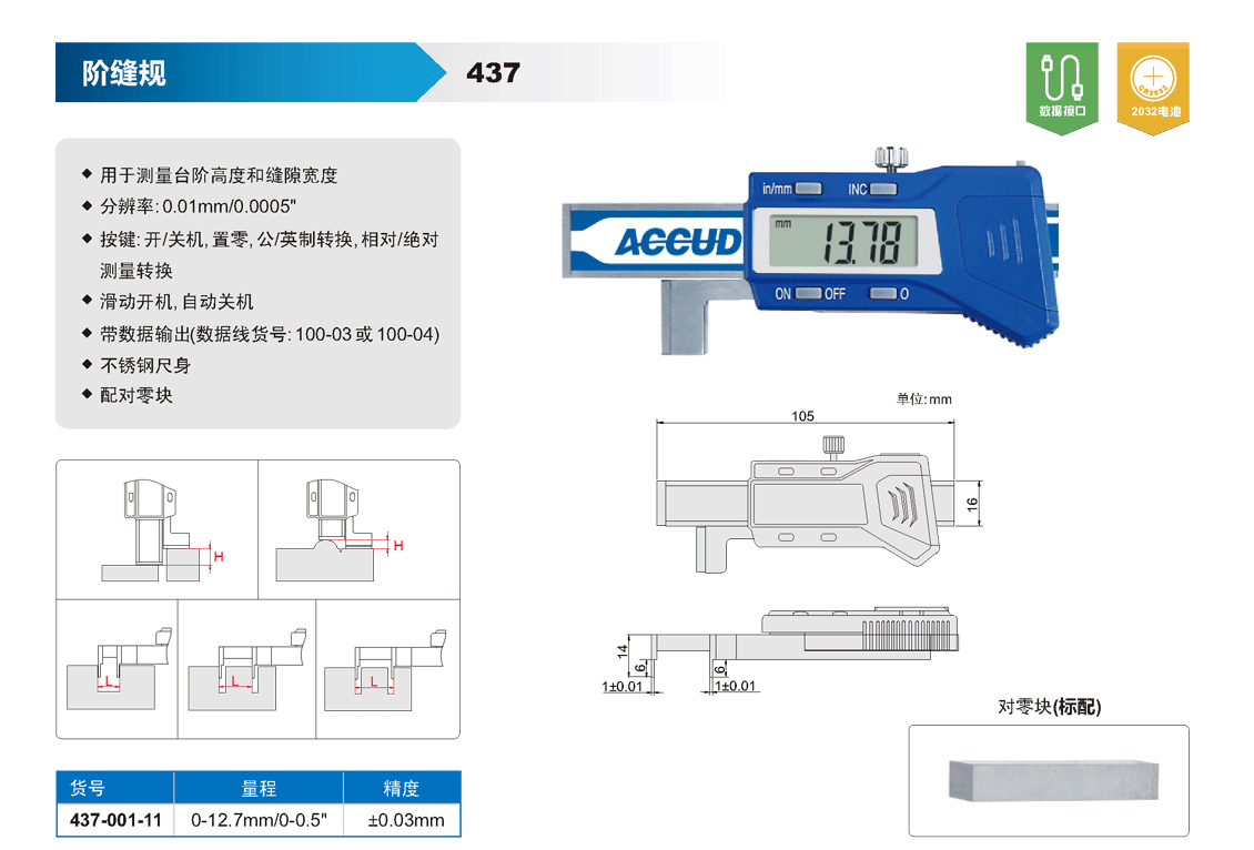 ? 按鍵: 開/關(guān)機(jī), 置零, 公/英制轉(zhuǎn)換,