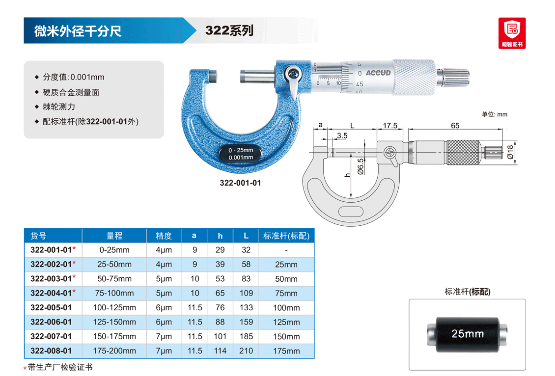 簡短描述: ? 符合JJG外徑千分尺國家計量檢定規(guī)程 ? 分度值: 0.001mm ? 硬質(zhì)合金測量面 ? 棘輪測力 ? 配標準桿(除322-001-01外)