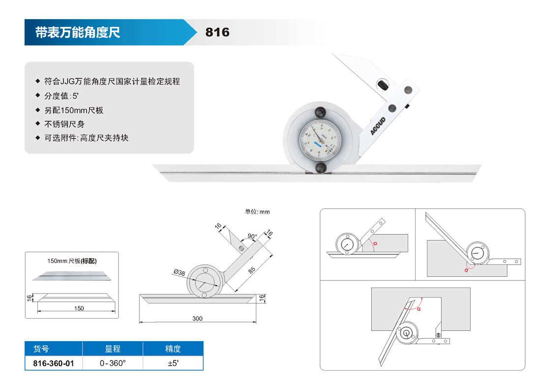 簡短描述: ? 符合JJG萬能角度尺國家計量檢定規(guī)程 ? 分度值:5' ? 另配150mm尺板 ? 不銹鋼尺身 ? 可選附件: 高度尺夾持塊