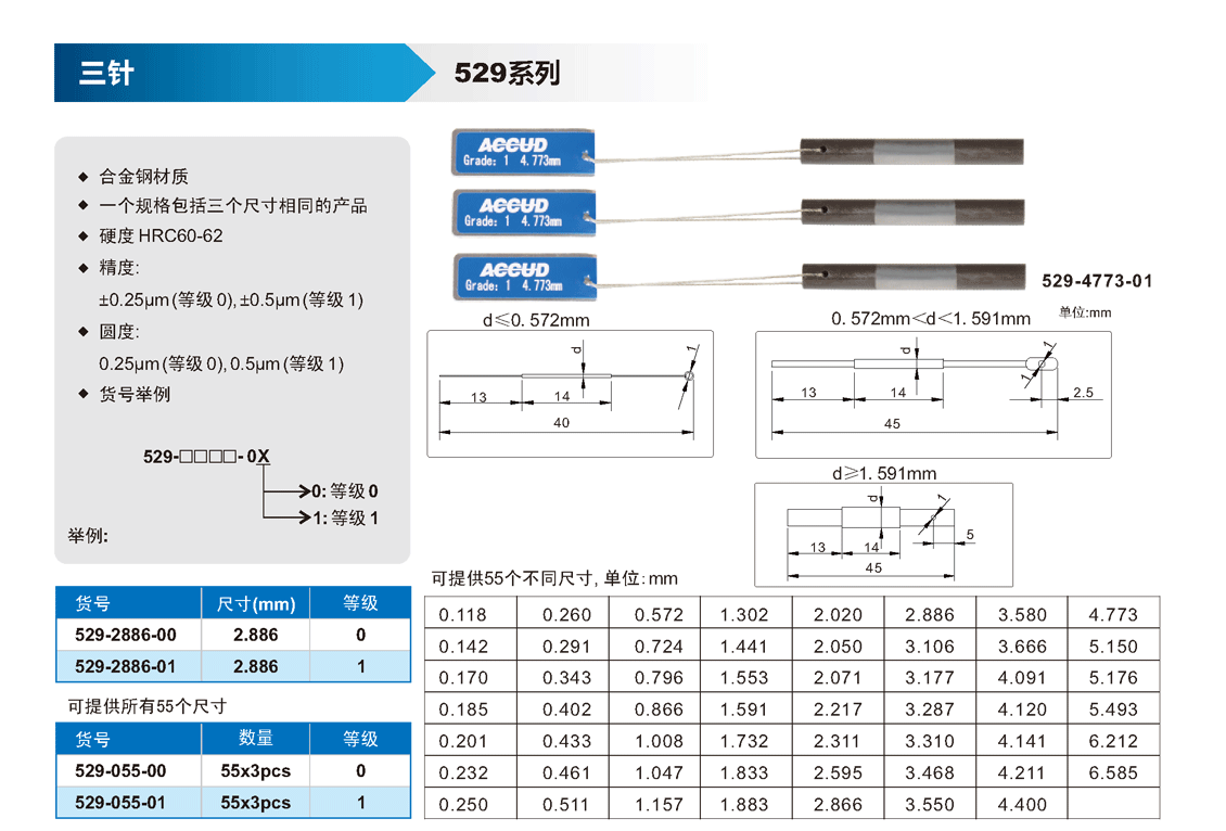 簡(jiǎn)短描述: ? 合金鋼材質(zhì) ? 一個(gè)規(guī)格包括三個(gè)尺寸相同的產(chǎn)品 ? 硬度HRC60-62 ? 精度: ±0.25μm (等級(jí) 0), ±0.5μm (等級(jí) 1) ? 圓度: 0.25μm (等級(jí) 0), 0.5μm (等級(jí)1)
