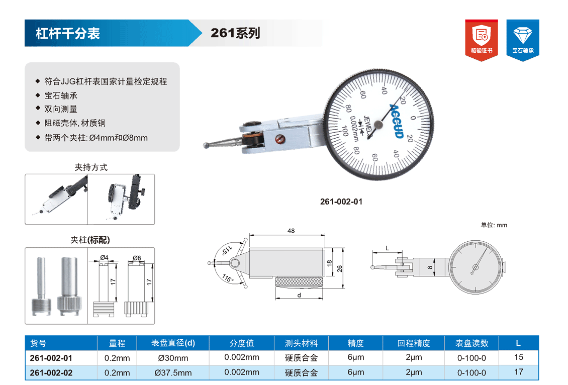 簡短描述: ? 符合JJG杠桿表國家計量檢定規(guī)程 ? 寶石軸承 ? 雙向測量 ? 阻磁殼體, 材質(zhì)銅 ? 帶兩個夾柱: ?4mm和?8mm