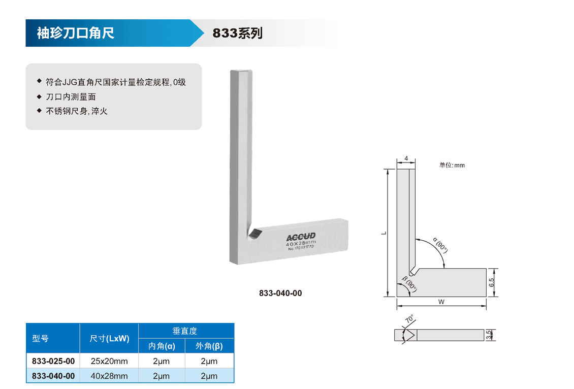 簡(jiǎn)短描述: ? 符合JJG直角尺國(guó)家計(jì)量檢定規(guī)程, 0級(jí) ? 刀口內(nèi)測(cè)量面 ? 不銹鋼尺身, 淬火