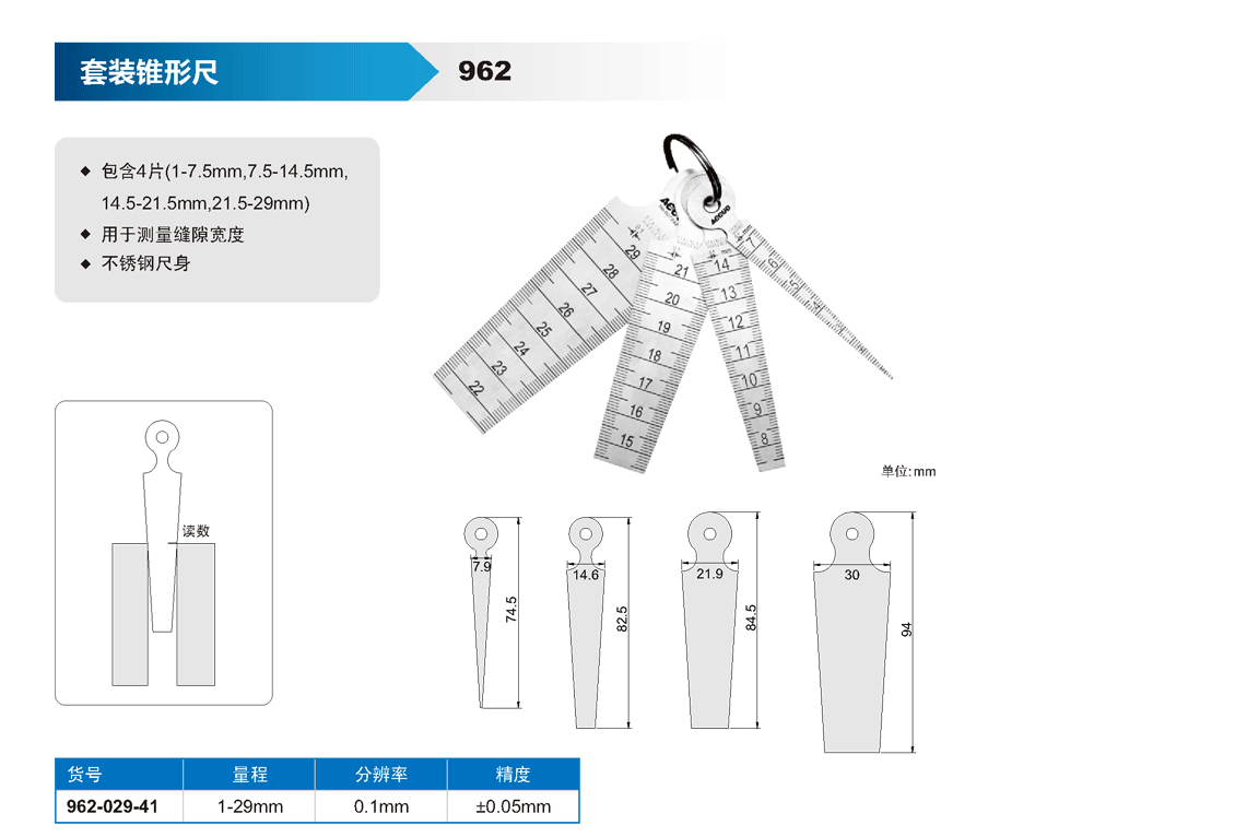 簡(jiǎn)短描述: ? 包含4片(1-7.5mm,7.5-14.5mm, 14.5-21.5mm,21.5-29mm) ? 用于測(cè)量縫隙寬度 ? 不銹鋼尺身