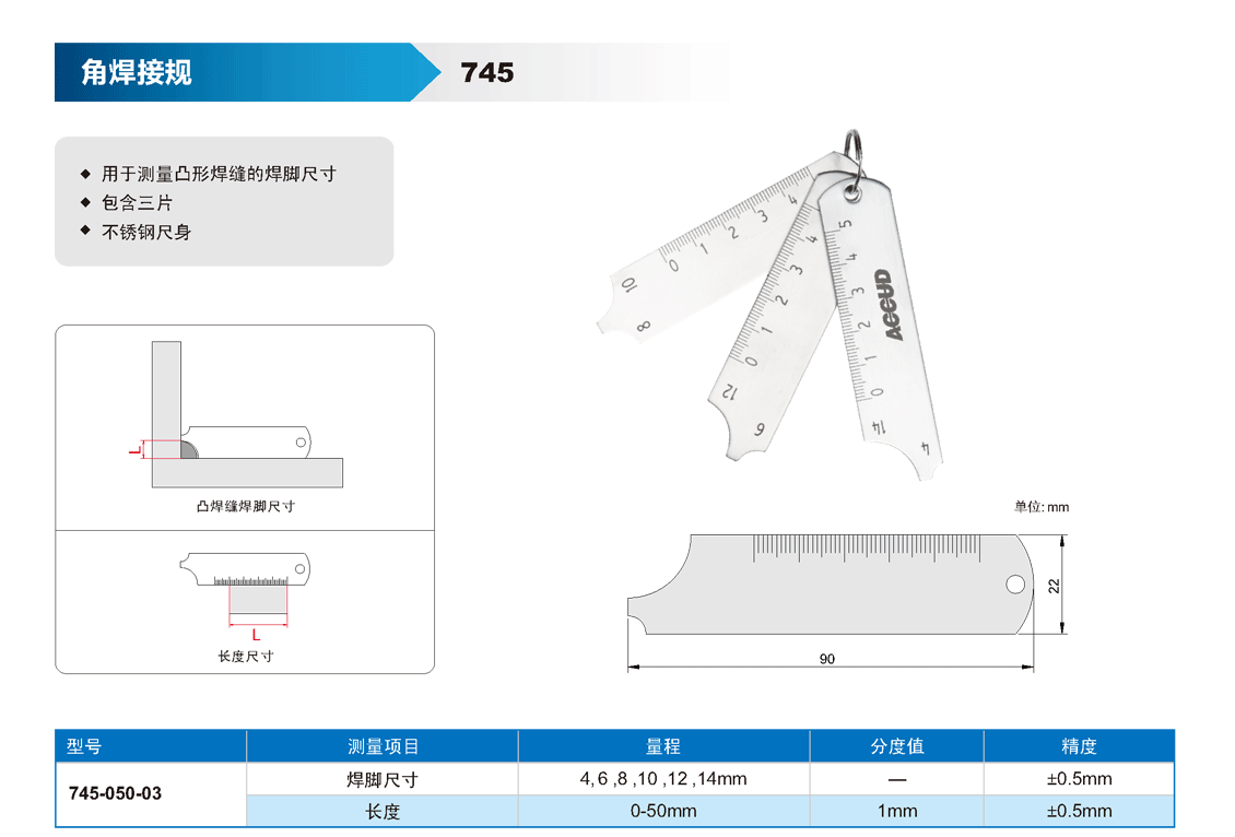 簡(jiǎn)短描述: ? 用于測(cè)量凸形焊縫的焊腳尺寸 ? 包含三片 ? 不銹鋼尺身