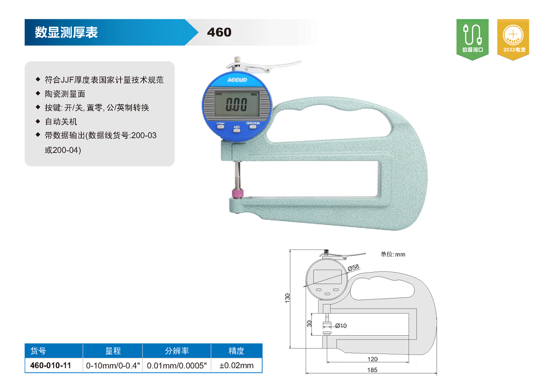 簡短描述: ? 符合JJF厚度表國家計(jì)量技術(shù)規(guī)范 ? 陶瓷測量面 ? 按鍵: 開/關(guān), 置零, 公/英制轉(zhuǎn)換 ? 自動(dòng)關(guān)機(jī) ? 帶數(shù)據(jù)輸出(數(shù)據(jù)線貨號:200-03 或200-04)