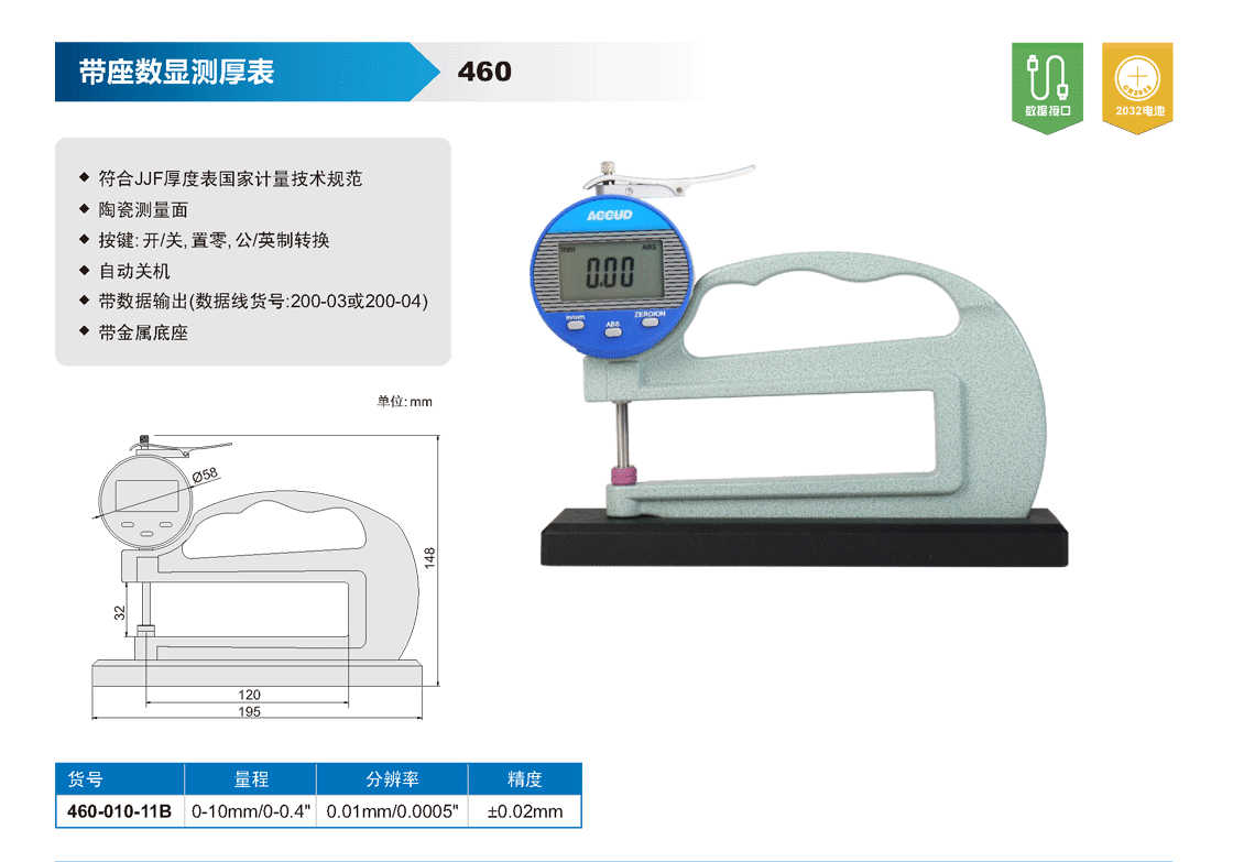 簡短描述: ? 符合JJF厚度表國家計量技術(shù)規(guī)范 ? 陶瓷測量面 ? 按鍵: 開/關(guān), 置零, 公/英制轉(zhuǎn)換 ? 自動關(guān)機 ? 帶數(shù)據(jù)輸出(數(shù)據(jù)線貨號:200-03或200-04) ? 帶金屬底座