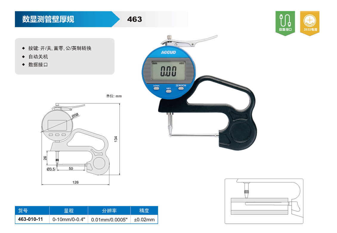 簡短描述: ? 按鍵: 開/關, 置零, 公/英制轉換 ? 自動關機 ? 數(shù)據(jù)接口