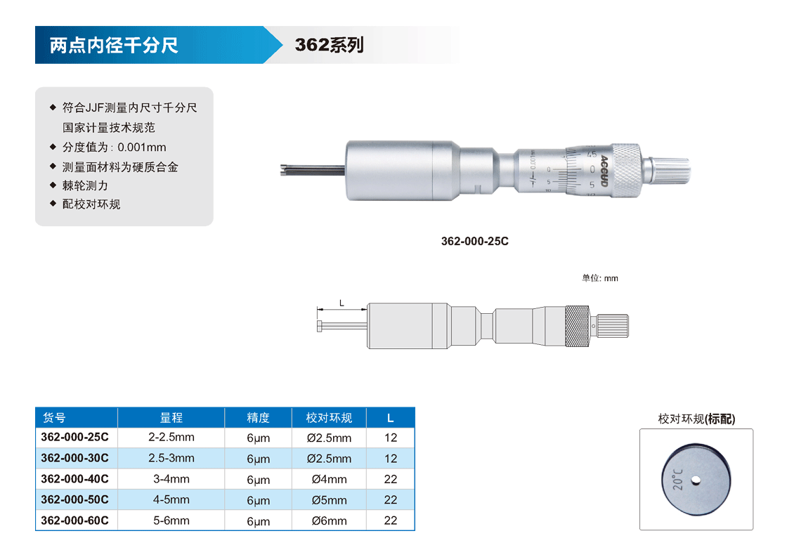 簡(jiǎn)短描述: ? 符合JJF測(cè)量?jī)?nèi)尺寸千分尺國(guó)家計(jì)量技術(shù)規(guī)范 ? 分度值為: 0.001mm ? 測(cè)量面材料為硬質(zhì)合金 ? 棘輪測(cè)力 ? 配校對(duì)環(huán)規(guī)