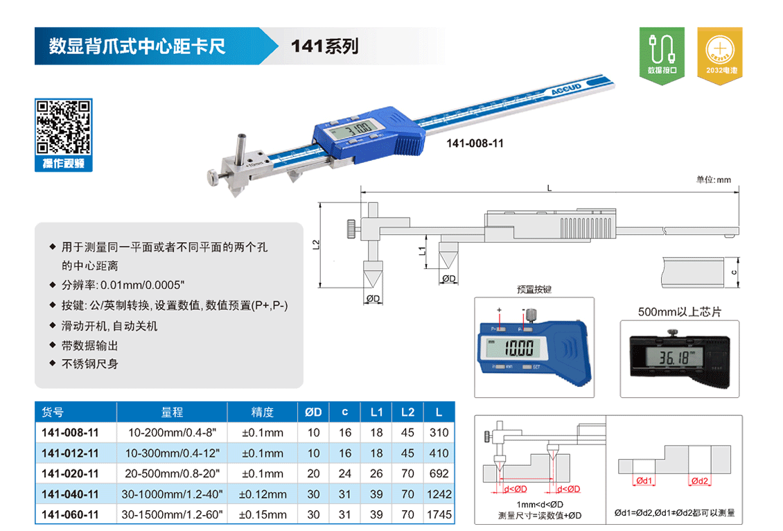 簡短描述: ? 用于測量同一平面或者不同平面的兩個孔的中心距離 ? 分辨率: 0.01mm/0.0005" ? 按鍵: 公/英制轉(zhuǎn)換, 設(shè)置數(shù)值, 數(shù)值預(yù)置(P+,P-) ? 滑動開機(jī), 自動關(guān)機(jī) ? 帶數(shù)據(jù)輸出 ? 不銹鋼尺身