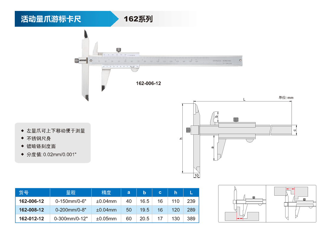 簡(jiǎn)短描述: ? 左量爪可上下移動(dòng)便于測(cè)量 ? 不銹鋼尺身 ? 鍍暗鉻刻度面