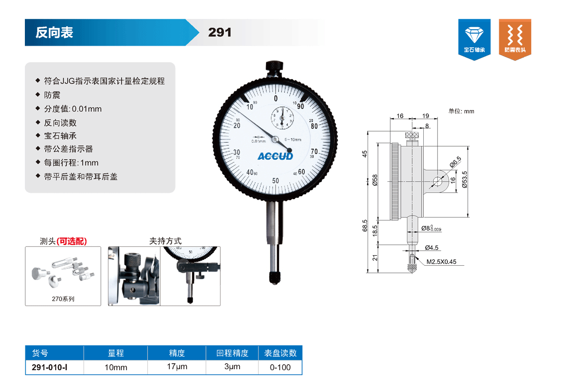 簡短描述: ? 符合JJG指示表國家計量檢定規(guī)程 ? 防震 ? 分度值: 0.01mm ? 反向讀數(shù) ? 寶石軸承 ? 帶公差指示器 ? 每圈行程: 1mm ? 帶平后蓋和帶耳后蓋