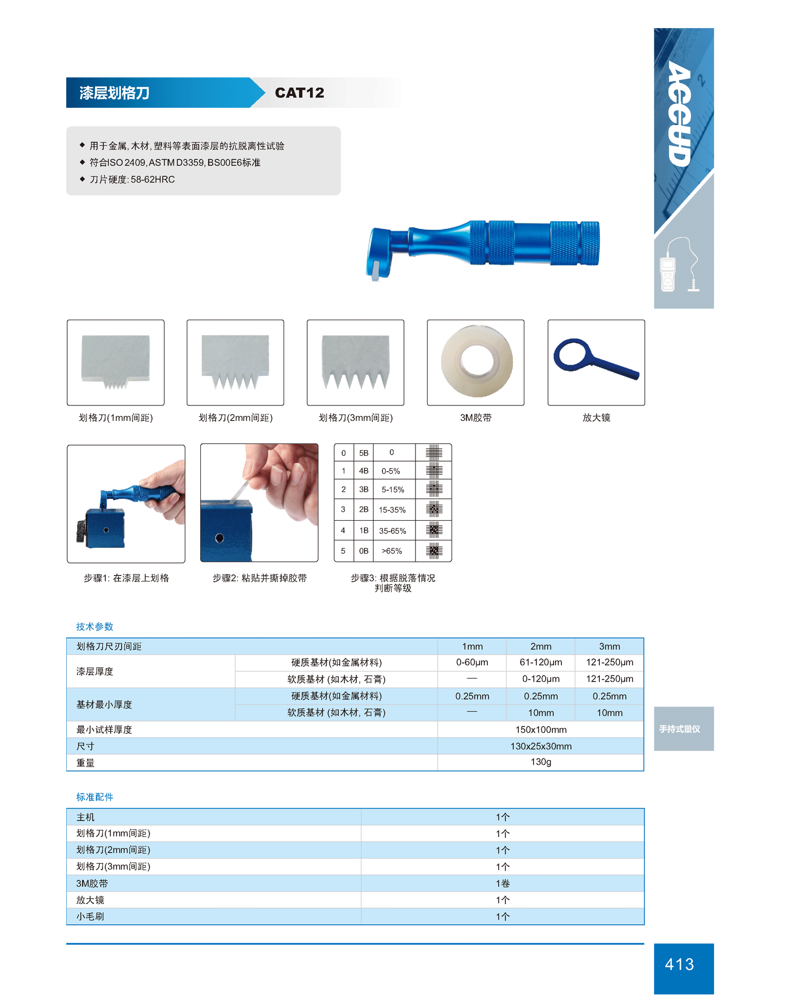 簡(jiǎn)短描述: ? 用于金屬, 木材, 塑料等表面漆層的抗脫離性試驗(yàn) ? 符合ISO 2409, ASTM D3359, BS00E6標(biāo)準(zhǔn) ? 刀片硬度: 58-62HRC