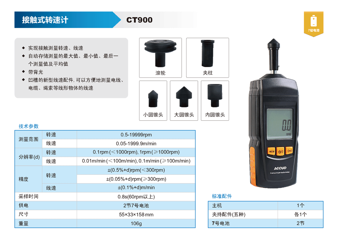 簡(jiǎn)短描述: ? 實(shí)現(xiàn)接觸測(cè)量轉(zhuǎn)速、線速 ? 自動(dòng)存儲(chǔ)測(cè)量的最大值、最小值、最后一 個(gè)測(cè)量值及平均值 ? 帶背光 ? 凹槽的新型線速配件,可以方便地測(cè)量電線、 電纜、繩索等線形物體的線速