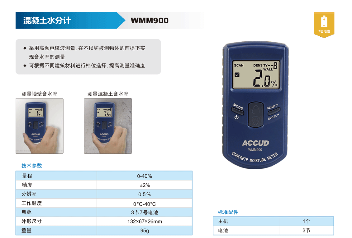 簡短描述: ? 采用高頻電磁波測量, 在不損壞被測物體的前提下實 現(xiàn)含水率的測量 ? 可根據(jù)不同建筑材料進行檔位選擇, 提高測量準確度