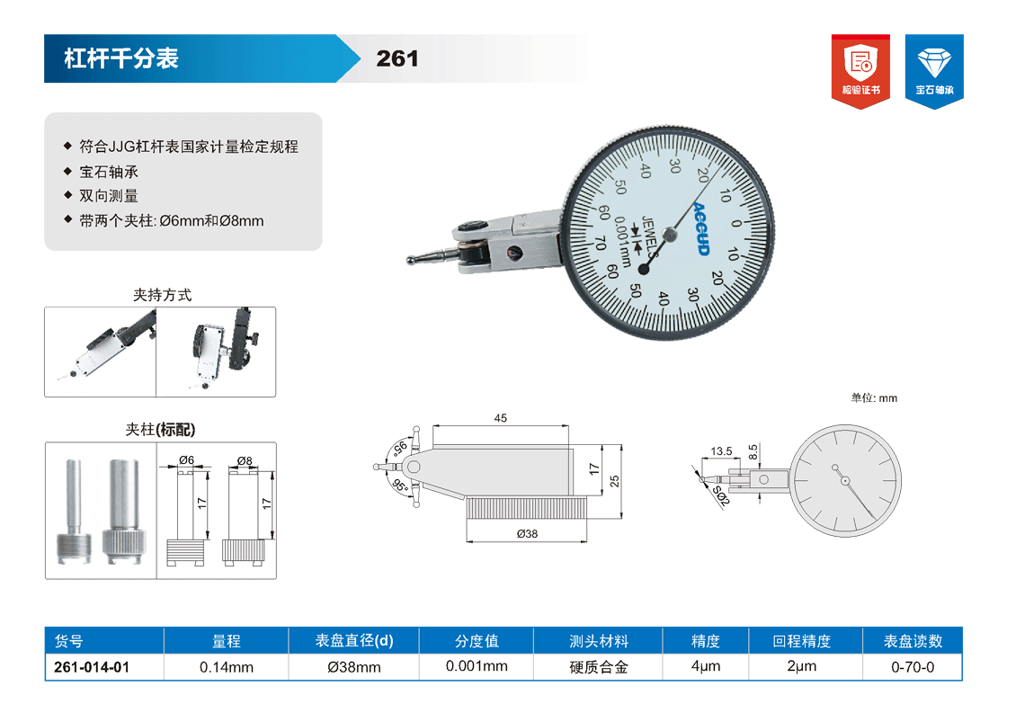簡短描述: ? 符合JJG杠桿表國家計量檢定規(guī)程 ? 寶石軸承 ? 雙向測量 ? 帶兩個夾柱: ?6mm和?8mm